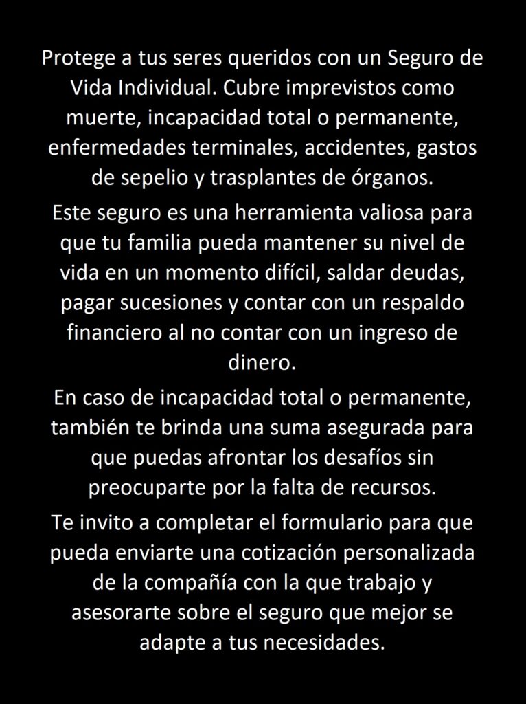 Por favor, activa JavaScript en tu navegador para completar este formulario.NOMBRE Y APELLIDO *NombreApellidosNúmero de CUIT: *SELECCIONAR PROFESION (EXISTE LA OPCION PARA SELECCIONAR EN CALIDAD DE DESEMPLEADO) *— Selecciona la opción —-SELECCIONAR OPCION-• ABOGADO• ACTIVIDADES FORESTALES• ACTIVIDADES SISTEMAS• ACTIVIDADES-ESPECTACULOS• ACTUARIO• ADMINISTRADOR DE HOTEL• ADMINISTRADORES• ADMINISTRATIVO• AFILADOR• AGENTE BURSATIL• AGENTE DE INMOBILIARIA• AGENTE DE VIAJES• AGRICULTOR• AGRIMENSOR• ALBAÑIL HASTA 10M• ALTOS FUNC.PUBLICOS/DIPL.• AMA DE CASA• ANALISTA DE SISTEMAS• ANESTESISTA• ANIMADOR FIESTAS• APARADORES• APICULTOR• ARQUITECTO• ARRIERO/RESERO• ARTESANO• ARTISTA (ACTOR-CANTANTE-M• ASADOR• ASCENSORISTA• ASESOR DE SEGUROS• ASESOR/CONSULTOR/AUDITOR• ASISTENCIA A ENFERMOS/ANC• ASISTENTE SOCIAL• AVICULTOR• AZAFATA• BACTERIOLOGO• BARRENDERO• BIBLIOTECARIO• BIOLOGO• BIOQUIMICO• CADETE (NO EN MOTO)• CAJERO• CALIGRAFO• CARPINTERO• CERRAJERO• CHANGADOR• CHAPISTA• CHOFER• CLOAQUISTA• COCINERO• COLCHONERO• COLOCADOR DE MOSAICOS, AZ• COMER. (QUÍM.SU.TOX.EXP)• COMER.NO(QUIM,SU.TOX.EXP)• COMERCIANTE• COMPUTADOR CIENTIFICO• CONTACTOLOGO• CONTADOR PUBLICO• CONTRATISTA• COSTURERA• CROUPIER• CUIDADOR DE BAÑOS• CUIDADOR DE CABALLOS• CUIDADOR DE VEHICULOS• CURTIDOR• DECORADOR DE AMBIENTES• DEPORTISTA PROFESIONAL• DESEMPLEADO• DESPACHANTE DE ADUANA• DIBUJANTE• DIRECTOR/ EMPRESARIO• DISCJOCKEY• DISEÑADOR DE MODA• DISEÑADOR GRAFICO• DISEÑADOR INDUSTRIAL• DOCENTE• DOCTOR EN CIENCIAS JURIDI• DOCTOR EN CIENCIAS POLITI• EBANISTA• ECONOMISTA• EJECUTIVO DE CUENTAS• ELECTRICISTA• EMPAPELADOR• EMPL.PUBL.(NO EN VIA PUB)• EMPLEADO DE ASERRADERO• EMPLEADO DE SEGURIDAD• EMPLEADO ESTACION DE SERV• EMPLEADO FUERZA AEREA• EMPLEADO MARINA• EMPLEADO PODER JUDICIAL• EMPLEADO PODER LEGISLATIV• EMPLEADO RURAL VARIOS• EMPLEADOS DE ADUANA• EMPLEADOS DE LAVADEROS• EMPLEADOS DEL EJERCITO• EMPLEADOS TRIPULACION DE• ENCARGADO DE EDIFICIO• ENCUADERNADOR• ENFERMERO• ESCRIBANO• ESCRITOR• ESCULTOR• ESQUILADOR• ESTADISTICO• ESTANCIERO/HACENDADO• ESTIBADOR• ESTUDIANTE (CARRERA REL.C• ESTUDIANTE (CARRERA RELAC• ETNOLOGO• FABRICANTE ART.CUERO• FARMACEUTICO• FILETERO• FISICO• FISIOTERAPEUTA• FLETERO• FLORICULTOR• FONOAUDIOLOGO• FOTOGRAFO REVELADORES• FRENTISTA• FRUTICULTOR• FUMIGADOR• FUNDIDOR• GALVANIZADOR• GANADERO• GARAGISTA• GASISTA• GEOLOGO• GESTOR• GRAFOLOGO• GRANJERO• GUARDA DE TREN• GUIA DE TURISMO• GUIONISTA• HERRERO• HILANDERO• IMPORTADOR-EXPORTADOR• IMPRENTERO• INDUSTRIAL• INGENIERO• INGENIERO AGRONOMO• INGENIERO CIVIL• INGENIERO ELECTRICISTA• INGENIERO ELECTROMECANICO• INGENIERO ELECTROTECNICO• INGENIERO EN MINAS• INGENIERO EN SISTEMAS• INGENIERO FORESTAL• INGENIERO INDUSTRIAL• INGENIERO MECANICO• INGENIERO NAVAL Y MECANIC• INGENIERO QUIMICO• INSTALACIONES EN ALTURA• INSTRUMENTISTA• JARDINERO (SIN PODA DE ARBOLES)• JUBILADO• KINESIOLOGO• LADRILLERO / HORNERO• LANCHERO• LETRISTA• LEÑADOR• LIC.ADMINISTRACION DE EMP• LIC.EN BELLAS ARTES• LIC.EN CIENCIAS DE LA EDU• LIC.EN CIENCIAS DE LA INF• LIC.EN CIENCIAS ECONOMICA• LIC.EN HISTORIA• LIC.EN MARKETING• LIC.EN PUBLICIDAD• LIC.EN RELACIONES PUBLICA• LIC.EN SEGUROS• LIC.EN SISTEMAS• LIC.EN TURISMO• LIC.FILOSOFIA Y LETRAS• LITOGRAFO• LOCUTOR• LUSTRADOR DE CALZADO (NO• MAESTRO MAYOR DE OBRAS• MAESTRO PASTELERO• MANICURA• MANUALIDADES EN GRAL• MAQUILLADOR• MARMOLERO• MARTILLERO Y/O REMATADOR• MASAJISTA• MATEMATICO• MECANICO• MEDICO• METEOROLOGO• MIEMBRO DEL CLERO• MODISTA• MOZO• MUCAMA• MUSEOLOGO• NIÑERA• NUTRICIONISTA• OBRERO VIAL• OBRERO/TRABAJADORES DE LA• ODONTOLOGO• OPERARIO FAB.PROD.ALIMENT• OPERARIO INDUSTRIA AUTOMO• OPERARIO METALURGICO• OPERARIO(NO ALTURA, ALTA• OPTICO• OTROS TEXTILES• OTROS TRABAJADORES GRAFIC• PAISAJISTA• PARAMEDICO• PARQUETISTA• PASEADOR DE PERROS• PEDICURO• PELETERO• PELUQUERO• PENSIONADO• PERIODISTA• PERITO CONTABLE• PERSONAL ADMINISTRATIVO• PERSONAL DE LIMPIEZA (NO SILLETA)• PERSONAL DE MAESTRANZA• PERSONAL DOMESTICO• PICAPEDRERO• PILETERO• PILOTO LINEAS AEREAS• PINTOR• PINTOR ARTISTICO• PISCICULTOR• PIZZERO• PLOMERO (NO DE OBRA)• PLOMERO DE OBRA• POCERO• PODADOR• PODOLOGO• POLITICO• PORTERO• PROCURADOR• PRODUCTOR AGROPECUARIO• PRODUCTOR DE SEGUROS• PROMOTOR• PSICOLOGO• PSICOPEDAGOGO• PULIDOR• QUIMICO• RADIO OPERADOR• RADIOLOGO• RECEPCIONISTA• RENTISTA• REPARAC.MAQUIN/ART. HOGAR• REPARACION DE ASCENSORES• REPARACION DE NEUMATICOS• REPARTIDOR (CON O SIN VEH• SALINERO• SASTRE• SEPULTURERO/CUIDADOR DE C• SERENO• SERVICIO DE INVESTIGACION• SOCIOLOGO• SOLDADOR• SOPORTE TECNICO• SOPORTE TECNICO TELEFONIC• TABACALERO• TALABARTERO• TALLISTAS EN MADERA• TAMBERO• TAPICERO• TAQUIGRAFO• TAREAS DE CARGA Y DESCARG• TAREAS DE MANTENIMIENTO (• TASADOR• TECHISTA• TECNICO DE SEGURIDAD E HI• TECNICO EN REFRIGERACION• TECNICO EN TELEFONIA• TECNICO QUIMICO (ANALISIS• TEJEDORA• TELEMARKETER• TEOLOGO• TINTORERO• TIPOGRAFO• TOPOGRAFO• TORNERO• TRABAJADOR DE ALTOS HORNO• TRABAJADOR DE LA INDUSTRIA DEL GAS NATURAL• TRABAJADOR DE LA INDUSTRIA DEL PETROLEO• TRABAJADOR DE LA INDUSTRIA NUCLEAR• TRABAJADOR DE LA INDUSTRIA QUIMICA• TRABAJADOR MATADERO/FIGRO• TRABAJOS DE DEMOLICION• TRABAJOS DE INSTALACIONES• TRABAJOS EN CANTERA• TRABAJOS EN SILLETA (LIMP• TRADERS-REPRESENTANTES• TRADUCTOR• TRANSPORTISTA (MERCADERIA• VENDEDOR AMBULANTE• VENDEDOR EN SALON• VETERINARIO• VIAJANTE DE COMERCIO• VIDRIERISTA• VIDRIERO• VIGILANCIA• VITICULTOR• YESERO• ZAPATERO• ZURCIDORFECHA DE NACIMIENT